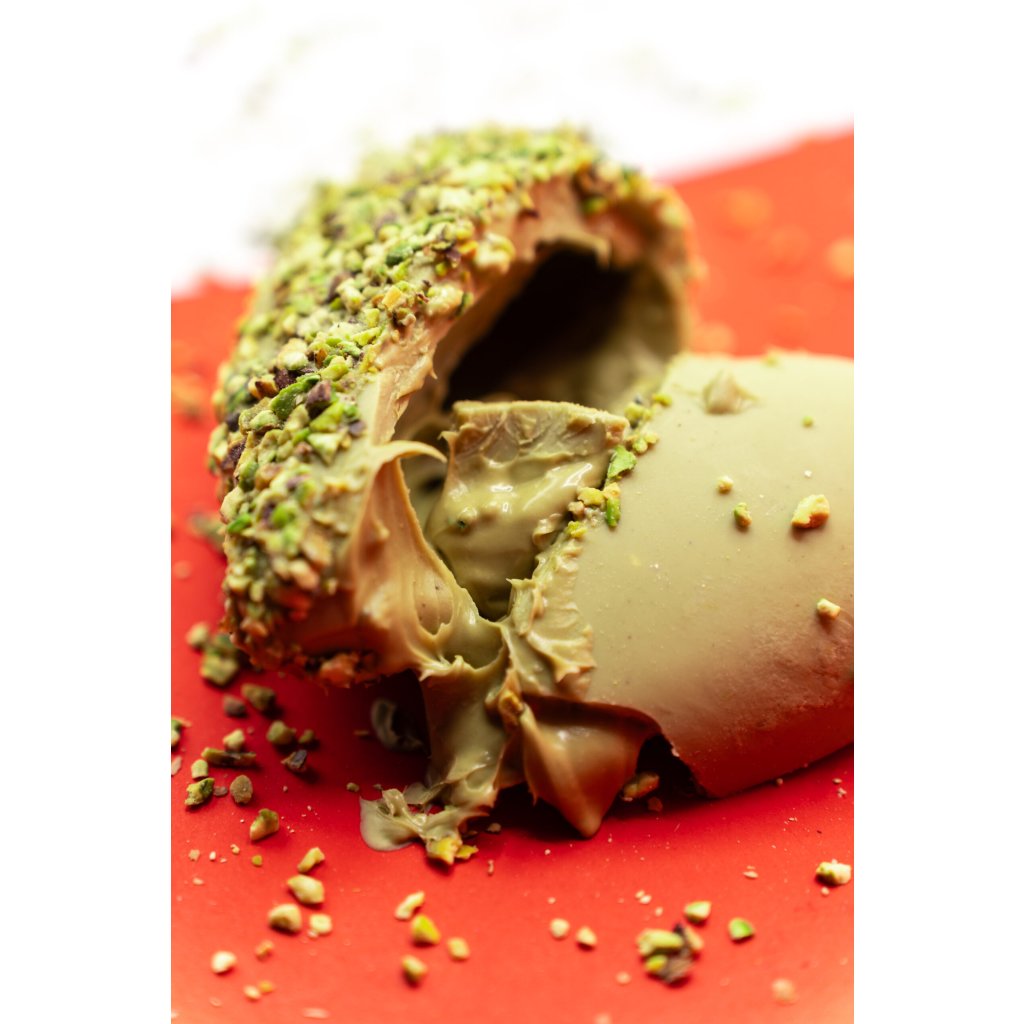 Složení: Pistáciová čokoláda (60 %): (cukr, pistácie (30 %), kakaové máslo, sušené plnotučné mléko, emulgátor: sójový lecitin, přírodní aroma vanilky, barvivo: E140); |