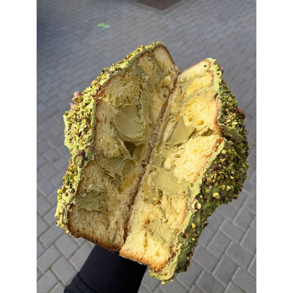 Poleva: bílá čokoláda, pistáciová pasta, pražená pistáciová posypka.